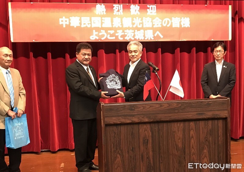 ▲中華民國溫泉觀光協會總理事長李吉田(左2)受邀至茨城縣,擔任台日友好交流協定簽訂見證人;茨城縣營業戰略部長堀江英夫(右2)贈與紀念物表示友好。(圖/記者白珈陽攝)
