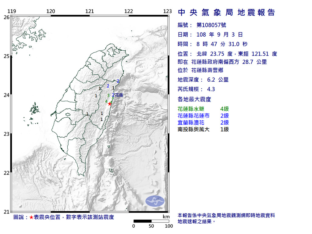 地牛翻身!根據中央氣象局的地震報告,3日上午8時47分發生芮氏規模4.3的有感地震,震央位於花蓮縣壽豐鄉,地震深度6.2公里,當地最大震度4級。