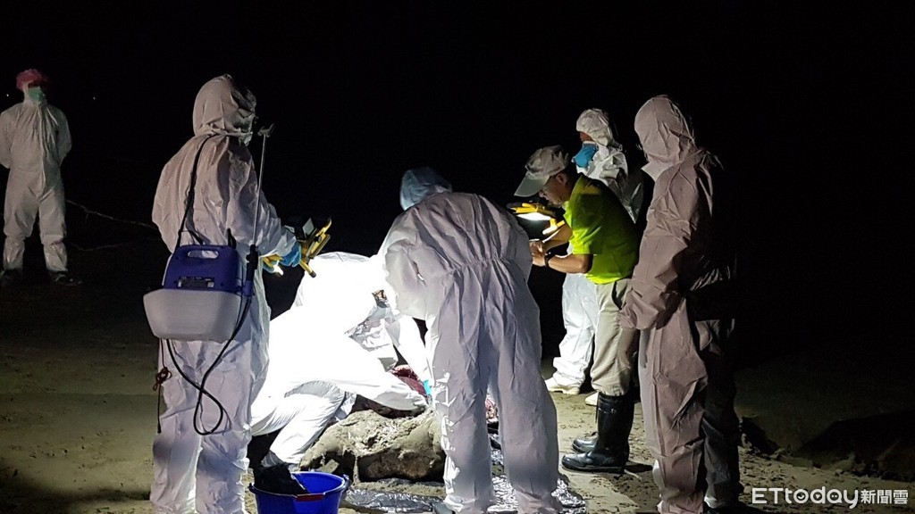 海巡人員以最嚴謹態度面對豬隻屍體,絲毫不敢大意,迅速穿著防護衣及防護裝備展開處置,遵照防檢疫標準處理程序,拉起封鎖線管制現場人員出入,目的為防止病原滋生或擴散之各種可能,後續於晚上8時30分,台南市動物防疫保護處周技正等7員抵達現場確認為豬隻屍體,並解剖採樣後實施焚燒及就地掩埋,其採樣結果由農委會家畜衛生試驗所預計2日後完成檢驗。