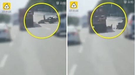 ▲ 外送員機車騎到一半突然翻車,整個人跌進大貨車車輪,慘遭輾斃 。(圖/翻攝自《梨視頻》)