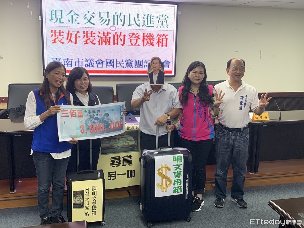 ▲台南市議會國民黨團強烈質疑民進黨「國庫通黨庫,黨庫通地方」,要求檢警調著手調查陳明文300萬元行李箱事件。(圖/記者林悅翻攝)