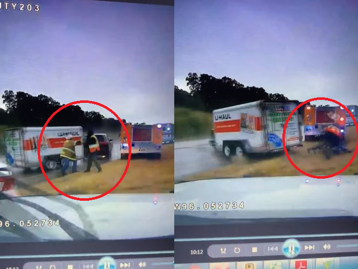 從影片中可以看見,身穿黃色衣服的消防員看見車子之後,試圖要將另一名隊友推開,但是一切發生的太快,兩人最後同時被車子撞飛一段距離後,在後方的草地墜落,而這一切也都被後方車輛的監視器錄下,畫面十分恐怖。