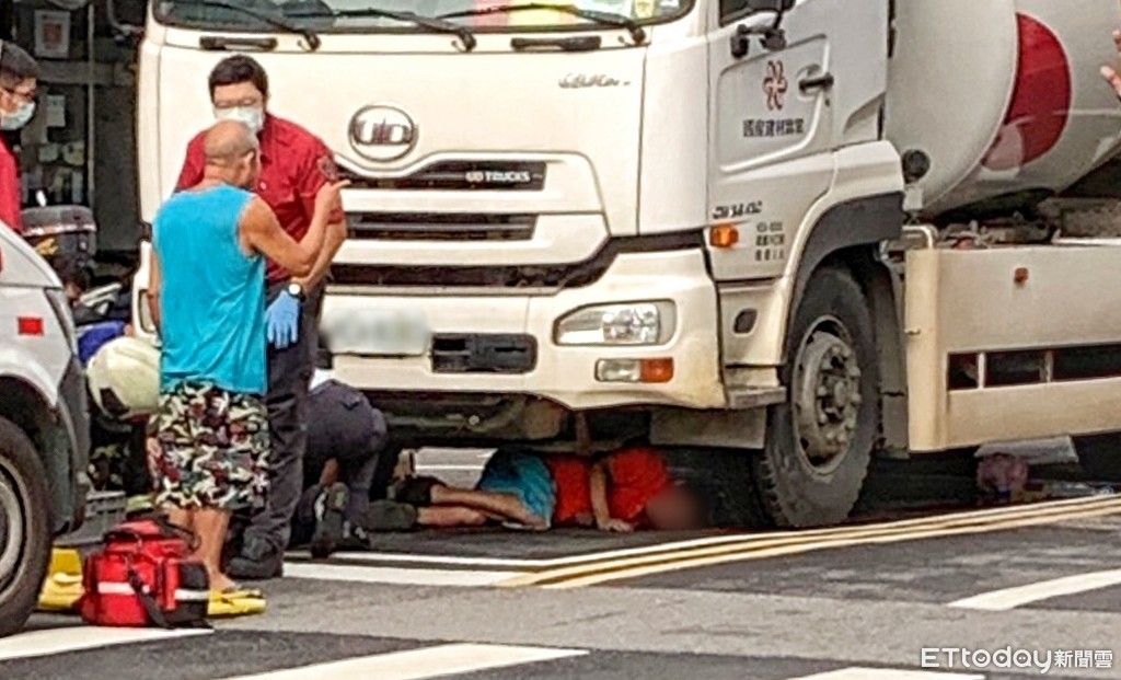 ▲男子穿越馬路時被起步的水泥預拌車捲入車底,救出時手腳擦傷,並無生命危險。(圖/記者黃彥傑翻攝)