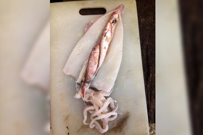 該名男網友在臉書社團「爆廢公社」PO文表示,他在家處理店家自稱「現撈」的透抽時,切開才發現內部竟有3隻秋姑(黃帶副緋鯉,又稱紅帶海鯡鯉、紅槽魚),讓他又驚又喜地說,「呃…這是買一送三的概念嗎?原來是這樣進食的」。