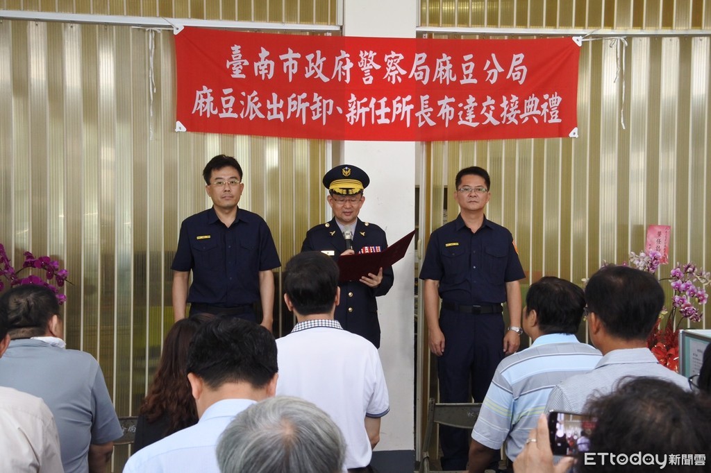 ▲台南市麻豆分局9月6日上午,分別在麻豆派出所及下營分駐所舉行卸、新任所長布達交接典禮,由麻豆分局長楊慶裕親自主持。(圖/記者林悅翻攝,下同)