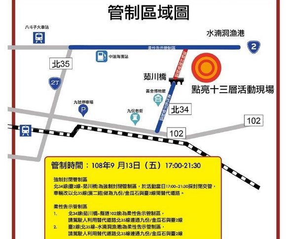 9月13日中秋節當天晚間7點將在水湳洞停車場舉辦「台電點亮十三層遺址公共藝術活動」,因應活動舉辦,水湳洞停車場中秋節當天不開放停車,台2線、北34線周邊道路下午5點至9點30分進行交通管制,建議民眾多利用大眾運輸工具,可搭公車(791、856、826、891、1811等路線)直達現場,也在瑞芳火車站或海科館轉乘免費接駁公車。