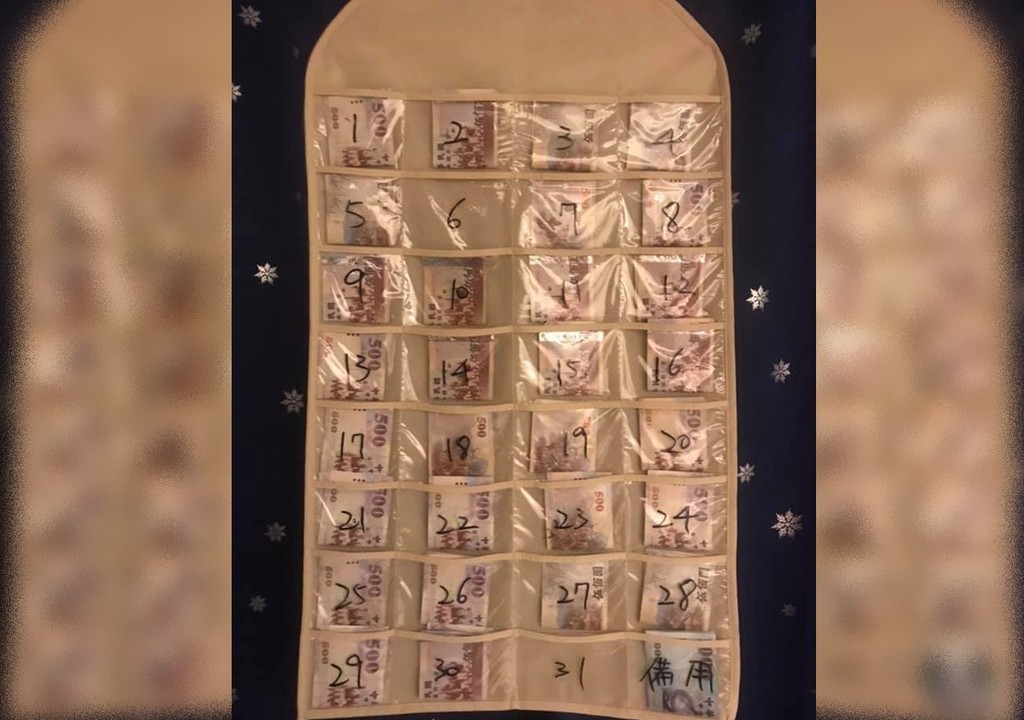原PO在爆廢公社貼出每天拿零用錢的多格收納袋,可以看見每一個透明袋子內都裝著500元鈔票,袋子外則寫著1號到31號的日期數字。原PO開心說「五號領薪水……發現我的零用錢被母老虎調高,200元變成500元,我深深的感受到,有錢人的生活,往往就是這麼樸實無華,且枯燥。」