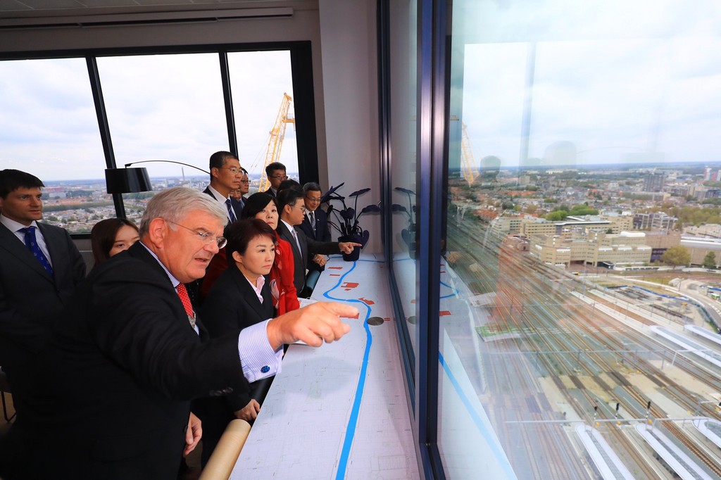 ▲烏特勒支市長范贊能向盧市長導覽窗外市政建設。(圖/台中市政府提供)