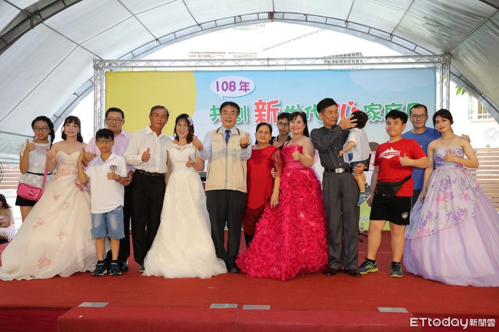 ▲台南市家庭教育中心舉辦「共創新世代家庭日」活動,許多親子穿著親子裝或新住民母國傳統服裝出席,市長黃偉哲為18對婚齡超過9年的新住民夫妻證婚,場面溫馨熱鬧。(圖/記者林悅翻攝,下同)