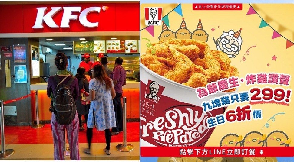 肯德基在官方LINE上宣布好康活動「為爺慶生,炸雞讚生」,今年9月9日是創始人桑德斯上校129歲生日,9塊炸雞桶下殺6折至299元,比前陣子的國際炸雞日更划算!