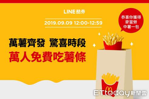 LINE今(9)日宣布於中午12點舉辦「萬薯齊發」招待萬人免費吃薯條活動,要送1萬份麥當勞中薯等多樣優惠商品,限時限量於12點開跑,1小時讓用戶免費抽,抽完為止。