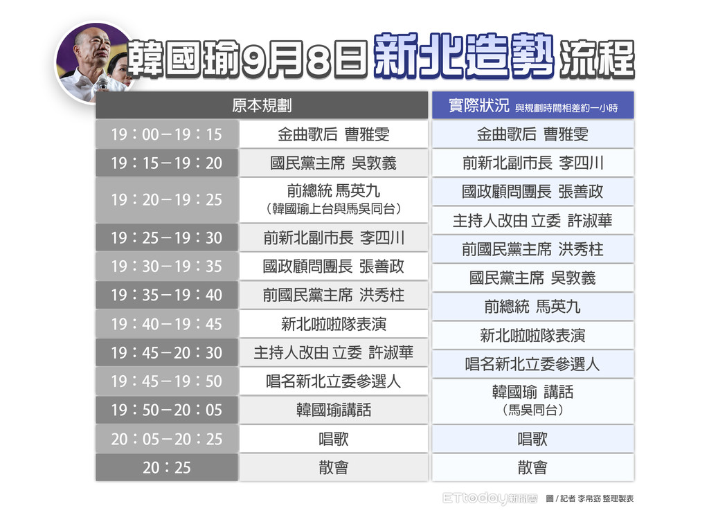 ▲韓國瑜9月8日新北造勢流程。(圖/記者李帛窈 整理製表)