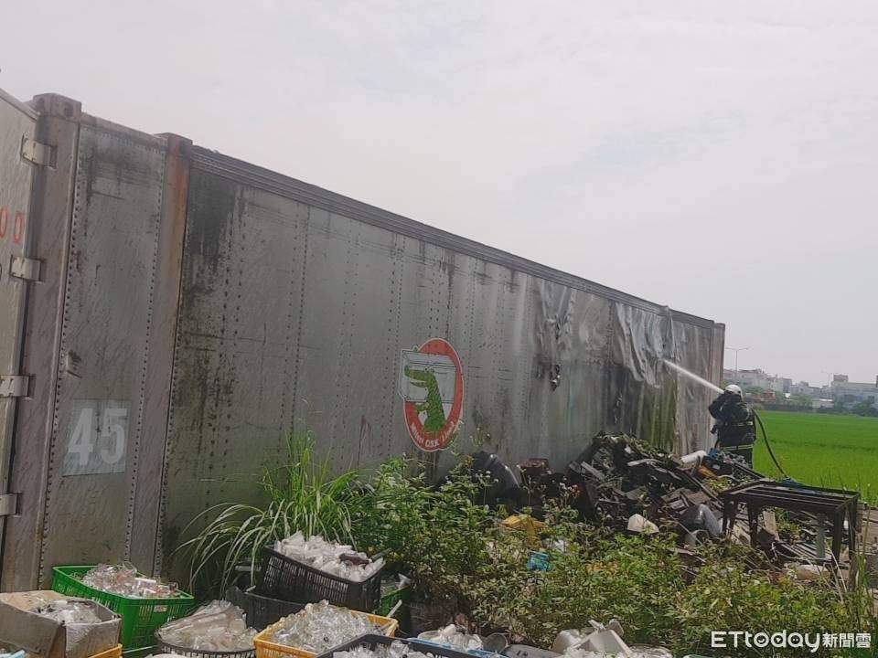 ▲火勢從外面雜物堆蔓延至貨櫃內,裝玻璃杯的紙箱也隨之起火燃燒。(圖/記者黃孟珍翻攝)