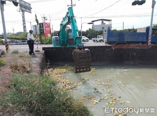 ▲嘉南農田水利會緊急雇工清除被倒棄在水路中的柚果。(圖/記者林悅翻攝)