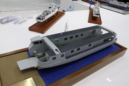 此外,中船集團還專門為071E外貿型登陸艦研發一種新概念、可配套搭載的可變船型雙體登陸艇。該艇長32.3米、寬9.6米,其展出模型攜帶2輛中型主戰坦克,或是攜帶3輛裝甲戰車。而這款變船型雙體登陸艇的最大「玄機」是其可以為一艘平底船,讓車輛和人員上船方便,但由於這種船型航行慢,因此為了提升航速,其縱向中部的船底就設計為可升降模式,航行時變身為一艘在速度上優勢明顯的雙體船。