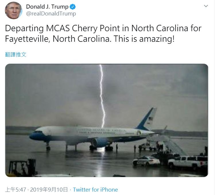當時布魯斯克拍下驚人的一幕後,立刻在推特上發文,「因為雷陣雨的緣故,總統被迫取消巡視多利安颶風襲擊的行程」、「這是在他到達不久後,出現在空軍一號背後的閃電。」當晚,川普也在推特上分享這張照片,直呼這畫面實在「太驚人了」。