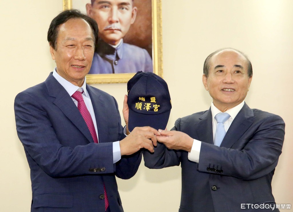 ▲王金平贈送順澤宮帽子給郭台銘。(圖/記者屠惠剛攝)