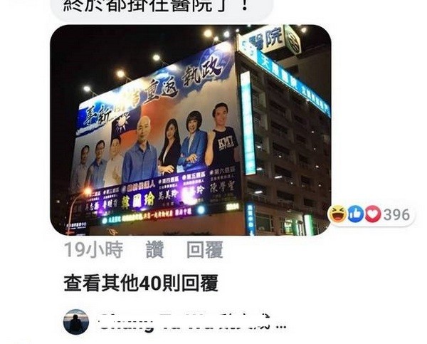 隨著2020總統大選日漸逼近,選情逐漸升溫!桃園中壢區一家知名醫院外牆,最近出現一幅國民黨提名總統參選人韓國瑜和桃園市6立委參選人,以「革新團結.重返執政」為訴求的巨幅選舉看板,經臉書社群「我是中壢人」貼出後,引來網友狂酸,「還沒選就全部掛在醫院了」、「可掛不可投,硬投一定掛」!