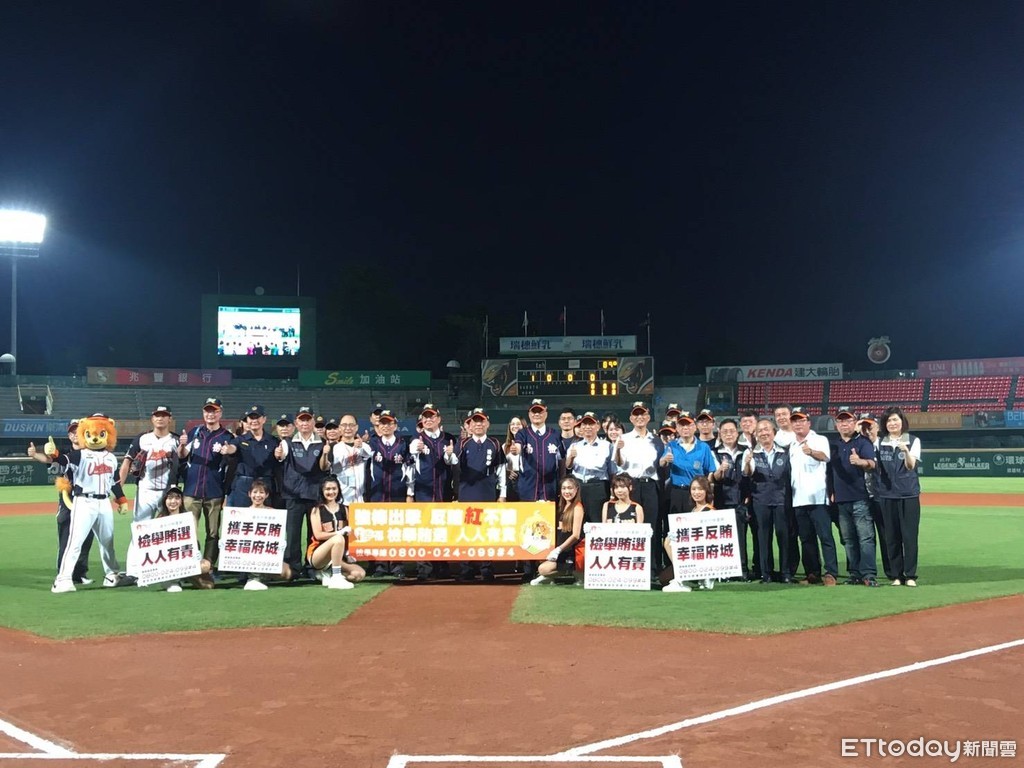 ▲台南地檢署特結合在地職棒球隊統一7-ELEVEn獅隊,在台南市立棒球場,辦理「強棒出擊‧反賄紅不讓」反賄選宣導活動。(圖/記者林悅翻攝)