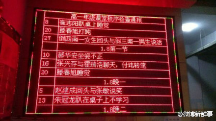 根據網傳照片,一個電子螢幕上顯示了違反秩序同學的班級及姓名,還明確的寫出第幾節課。最讓人吃驚的是,除了睡覺、聊天等,連坐姿不正、轉筆也被通報,嚴格程度讓不少網友直呼「太凶殘了」。