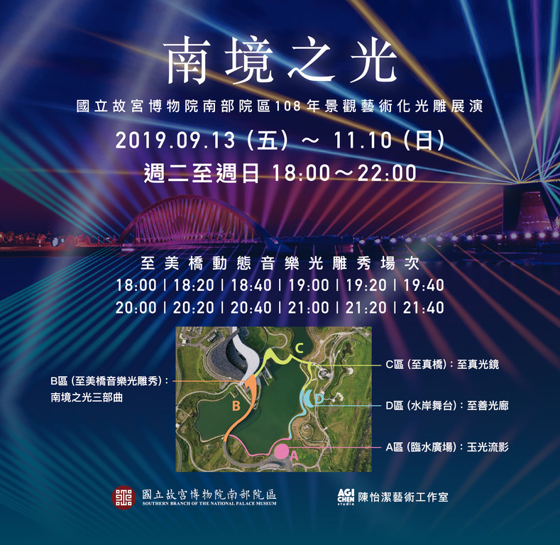 暑假期間浪漫水舞後,故宮南院再次推出絕美光雕秀「南境之光」,以博物館與至美橋為演出主視覺,透過新穎的雷射與燈光設計技術,將光衣披覆在環湖步道上,打造360度的環湖觀賞視角,讓音樂與燈光匯聚出的南院風情,9月13日到11月10日(每週二~週日),每晚6點到10點之間,每20分鐘演出視、聽覺令人讚嘆的聲光演出。