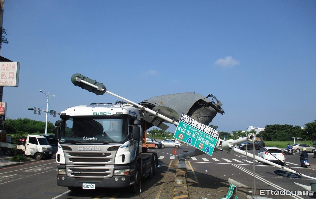 據了解,9月12日上午8時20分許,由1名楊姓司機駕駛的曳引車,後半拖車上搭載大型機械「刨路機」,行駛到中華南路與濱南路口右轉時,因刨路機履帶過高,擦撞路口號誌橫桿上的路名標示牌,造成整根號誌桿斷裂倒下,橫在馬路上妨礙交通,現場無人受傷。