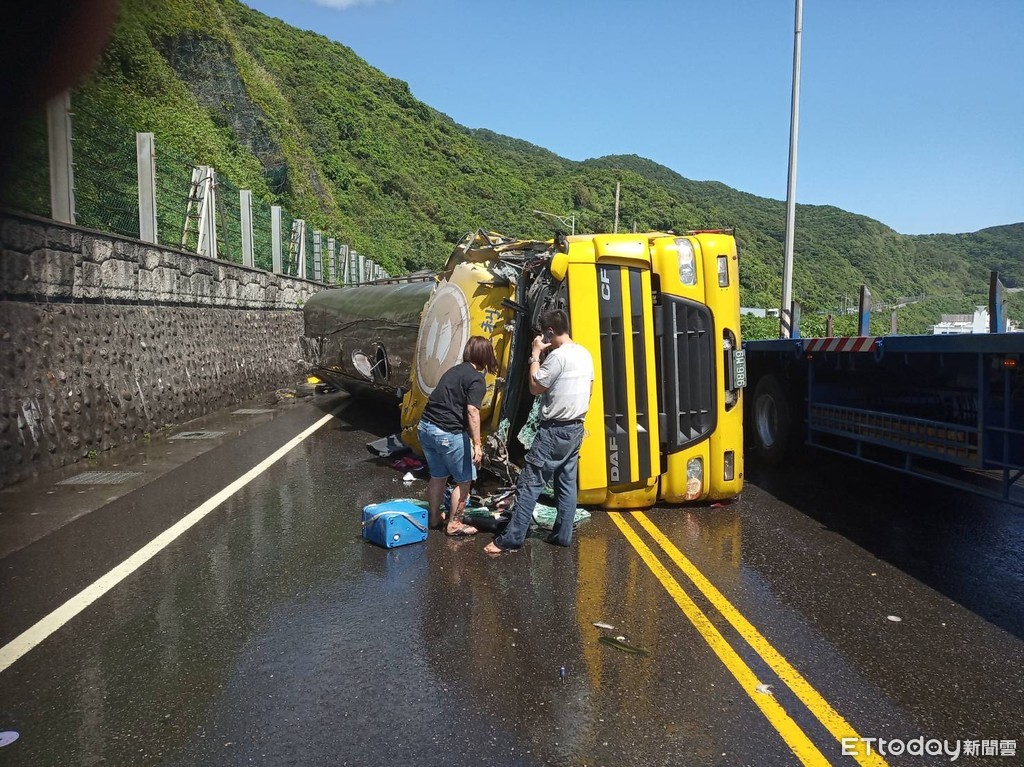 新北市貢寮區台2線(濱海公路)88.5K處13日上午10時07分發生車禍,一輛載運化學物品的營業用大貨車不慎翻覆,造成司機及其身旁的妻子受傷,目前已經送往醫院急救。
