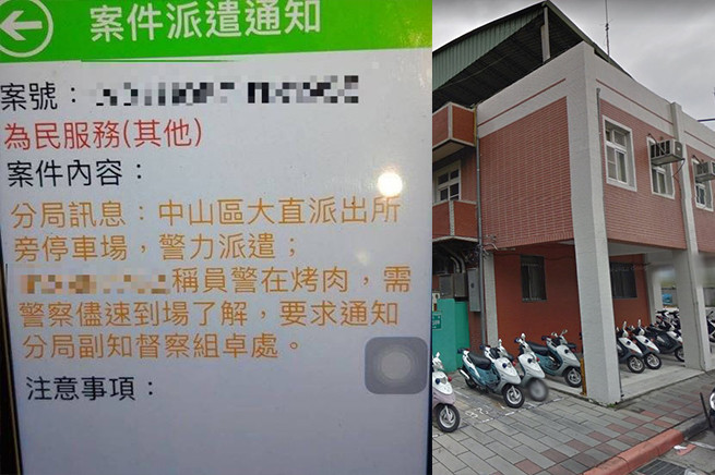 中秋烤肉是全民運動,但人民保母警察也需要過節,烤肉卻被民眾檢舉。一位熱心過頭的民眾檢舉,中山區大直派出所旁停車場,有員警烤肉被民眾檢舉,派遣通知曝光後引起網友撻伐。