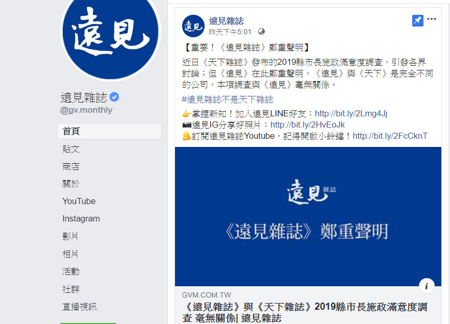 《遠見雜誌》聲明指出,近日《天下雜誌》發布的2019縣市長施政滿意度調查,引發各界討論;但《遠見》在此鄭重聲明,《遠見》與《天下》是完全不同的公司,本項調查與《遠見》毫無關係。《遠見雜誌》更強調「遠見雜誌不是天下雜誌」。