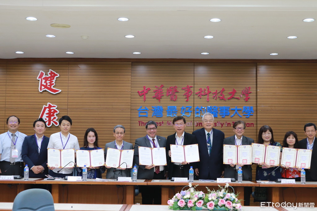 ▲中華醫大校長曾信超(右六)與日本、新加坡、菲律賓代表及南台灣的醫事類科大共同簽署大學社會責任實踐計畫合作意願書。(圖/記者林悅翻攝,下同)