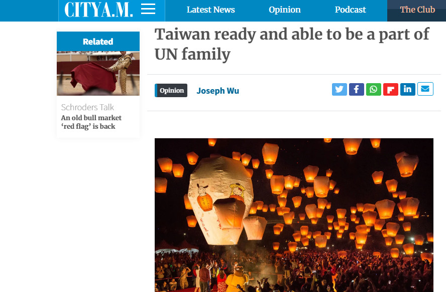 外交部長吳釗燮專文16日刊登上英國「金融城早報」頭版,呼籲聯合國應該要納入台灣,報導則以斗大標語「台灣已準備好、有意願也有能力作出貢獻」搭配台北101大樓照片呈現,強調台灣經驗豐富,但卻因政治因素被排除在相關會議之外,實屬「荒謬」(absurd)。