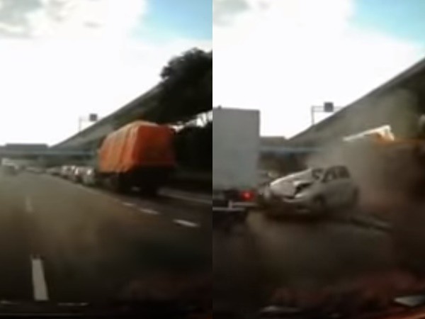 ▲網友曝光行車紀錄器畫面,事故當下大貨車後方根本就沒有來車追撞。(圖/翻攝YouTube)