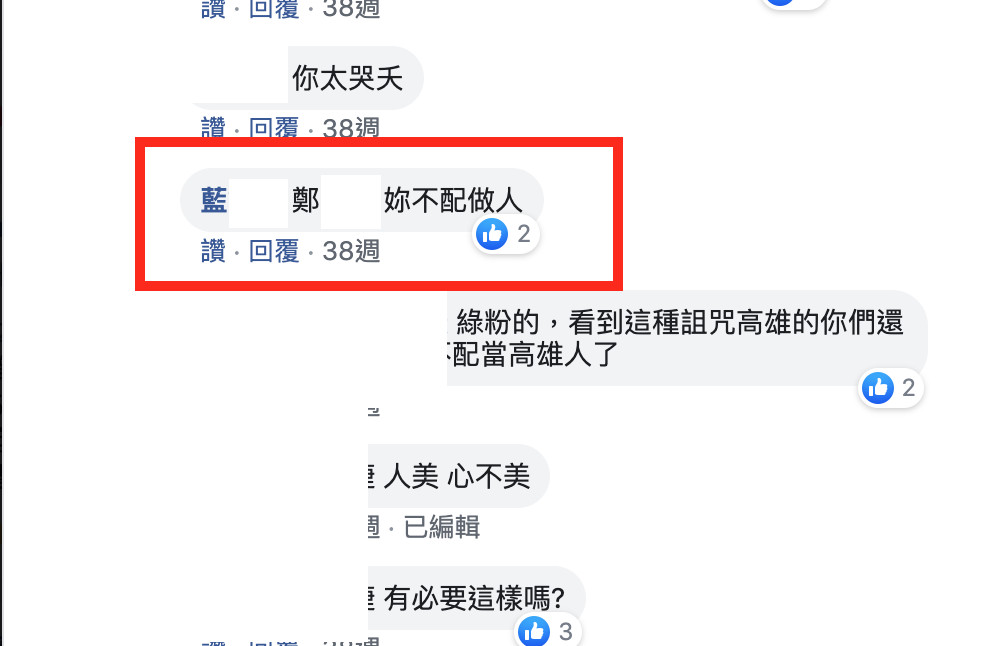 當時鄭姓網友在報導下方的留言區貼了一張靈堂圖後,立刻引發網友撻伐,有人勸她把圖拿掉、也有人希望她別唱衰高雄,但是一名家住在新北市的藍姓網友,直接寫了對方名字「鄭XX,妳不配作人」,結果遭到鄭姓網友來提告妨害名譽,現在高雄地方法院簡易庭在審理過後,認為藍姓網友只是單純因為不滿對方在新聞下方的留言,結果造成不特定多數可以閱覽,而且資料幾可永久留存在臉書網站粉專的留言版上頭回應「不配做人」,這有損及對方的人格尊嚴,所以構成公然污辱。