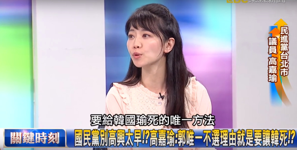 台北市議員高嘉瑜平時給人相當平易近人的形象,甚至經常在臉書上賣萌,說出言不由衷的「幹話」還會不由得笑場,但是在18日晚間播出的新聞節目《關鍵時刻》,談論到郭台銘不選對韓國瑜選情影響,卻一改平常形象兇狠發言指出,「給韓國瑜死唯一的方法就是郭台銘不選」。