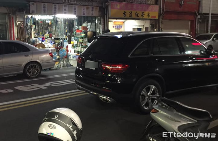 ▲苗栗縣苑裡鎮市區18日晚上吃飯時間,1輛賓士車就直接停在馬路中間,當作自家停車場,路邊民眾全看傻眼 。(圖/翻攝自Facebook/苑裡串起來)