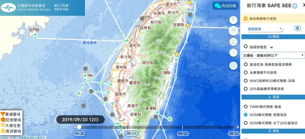 平台上,已有藍色公路海氣象預報、海岸潮線預報、漁業海溫預警及海難漂流預報等服務,一般民眾查詢可由https://safesee.cwb.gov.tw或官網海象/航行海象讀取資料,其中具地點或航線之隨選功能便利使用者查詢,在呈現上也將顯示介面提升為地理資訊呈現,未來該局仍會持續進行跨域合作提供多元應用產品,明年將再研發提供海岸休閒海象、帆船潮流預報、極端暴潮與海平面趨勢等產品。