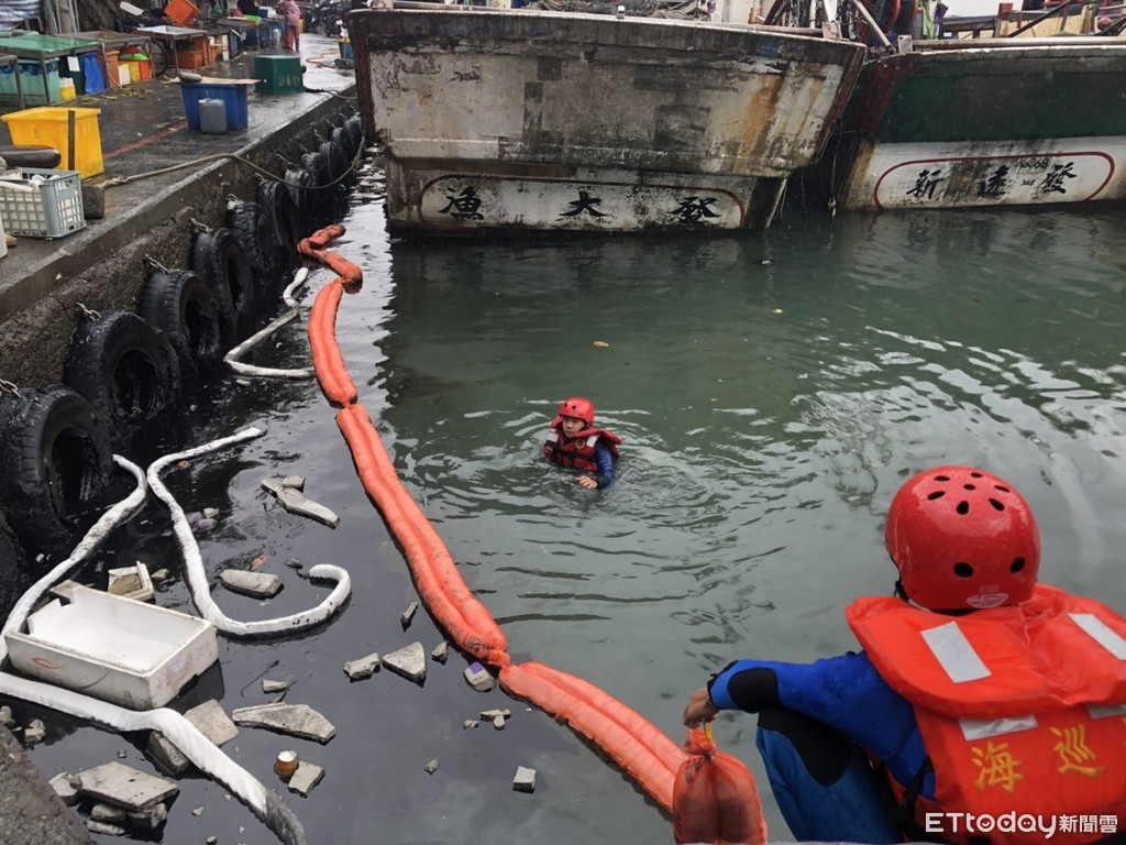 第一岸巡隊表示,20日上午10時許,大溪安檢所巡邏人員發現於大溪漁港中油站轉角處水面上有油污,為了不讓海洋遭受破壞,海巡人員攜帶吸油棉投入現場協助油污清除,並設置攔油索防止油污擴散。