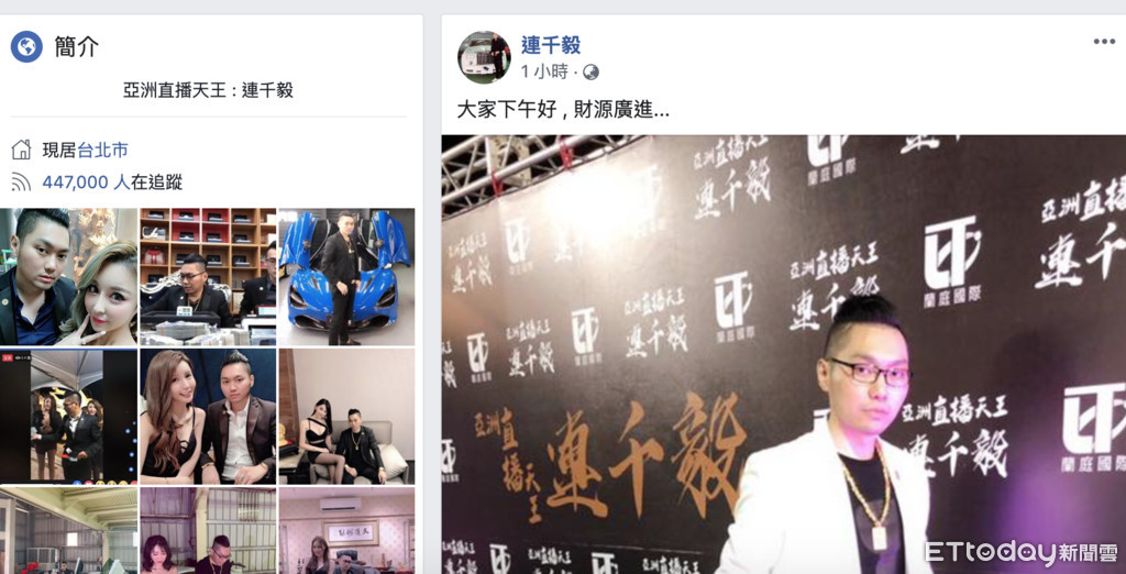 據了解,刑事局南打以及高雄市刑大的人員是在21日下午一點半左右登門抓人,而連千毅的臉書大約在記者發文前,一個小時前有發了一篇文章,同時附上了一張照片,這張照片當中,他就在站在一部白色超跑旁邊,超跑的車牌還是他的口頭禪「現主時」,還有一塊印有「亞洲直播天王連千毅」字樣的背板,看起來相當有氣勢,同時這篇發文,連千毅留了「大家下午好,財源廣進」。