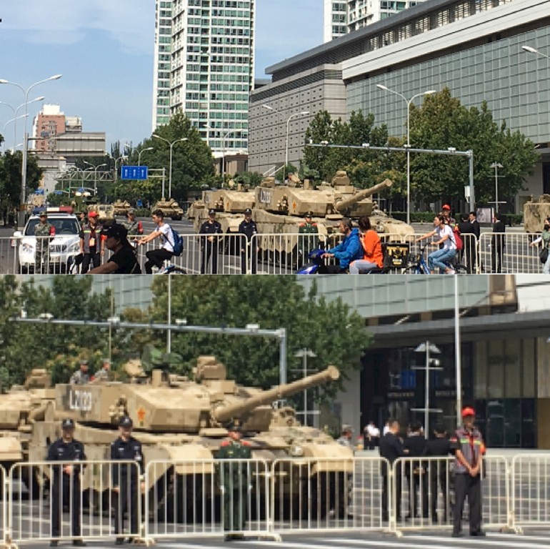 大陸十一閱兵演習進入最後演練,北京街頭出現壯觀奇景,坦克與老百姓在城市共處。數十台裝甲車和坦克車(23日)開進北京市重要街區,停在馬路中央待命演習。引起好奇民眾圍觀拍照「與坦克車最近的距離。」