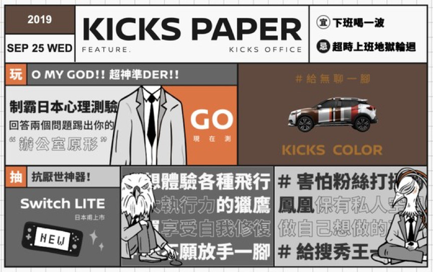 你知道嗎?色彩是上帝埋在人類身上的隱性DNA,外放的人偏愛粉色、高冷的人喜好深色,從出門穿什麼顏色的衣服、搭配什麼顏色的鞋,到手機、家電的色系,乃至車主選擇的車色,其實都默默反映出你的內在性格,選擇紅色的人表現慾強、具有王者風範;白色給人的印象則是靈巧敏銳、細膩、有點完美主義;喜歡深灰色的人則有富智慧、低調包容、照顧團隊的特質。NISSAN KICKS推出色彩心理學測驗網站,只要兩個問題就能診斷你的職場屬性、揭開盲點對症下藥,超神準的診斷馬上讓這個測驗在各辦公室瘋傳,你也是在職場裡載浮載沉的上班族嗎?快點揪前後左右的同事手刀來測,為自己點起一盞明燈。