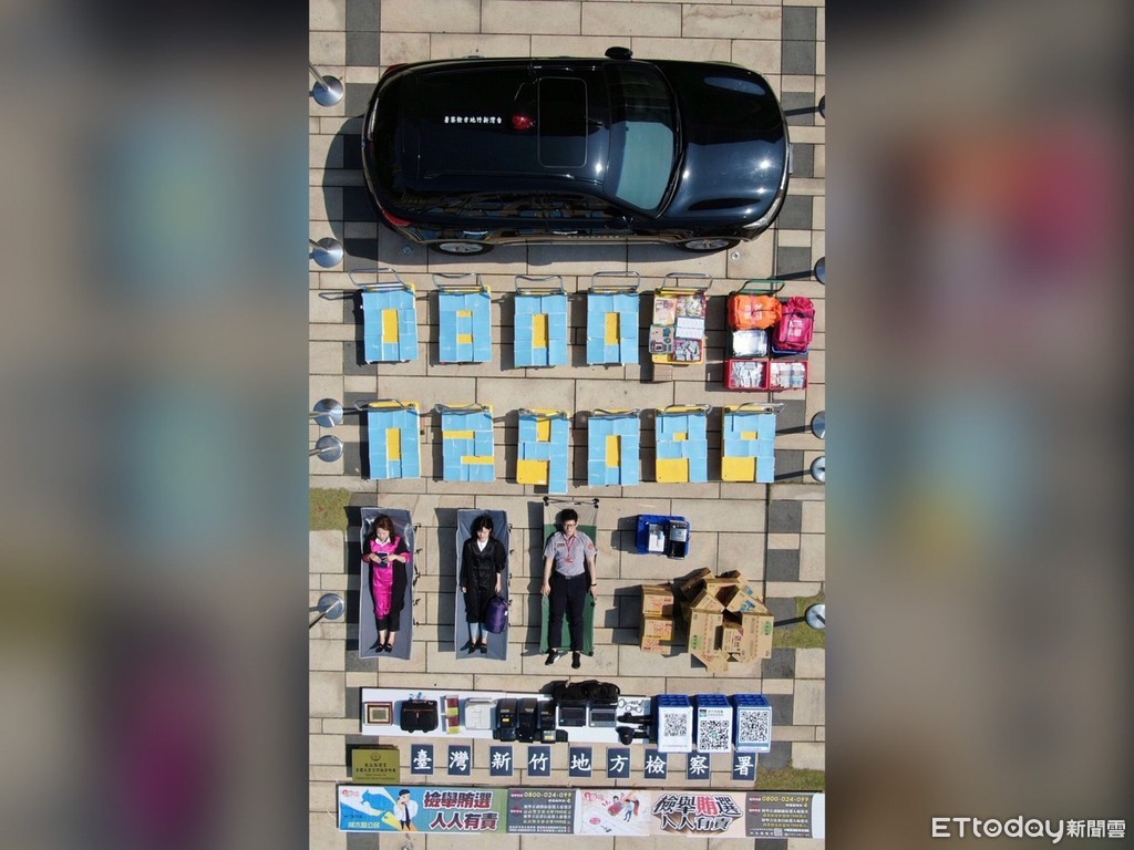 新竹地檢署25日上午於廣場前展示歷來查賄實績和各種科技查賄器材,透過開箱文方式將器材排列成法務部檢舉賄選專線「0800-024099圖像」,在搭配美女檢察官陪躺後利用空拍機俯拍,盛大畫面大大宣示查緝決心,正面迎戰明年大選繁忙的查賄工作。