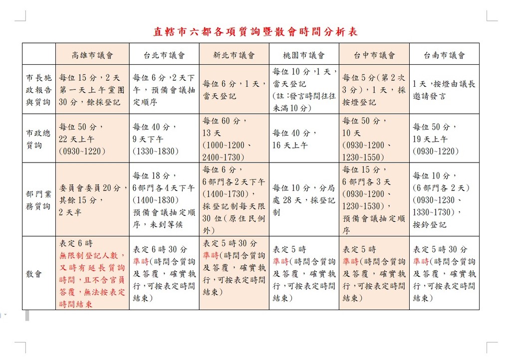 高雄市議會比較六都議程安排,高雄市議會「市長施政報告與質詢」議程進行2天,每位議員質詢15分鐘,並在第1天上午安排黨團質詢,比起台北市2個下午(合計1天時間)議程每人6分鐘質詢時間、新北市1天議程每人質詢6分鐘、桃園市1天議程每人10分鐘、台中市1天議程每人5分鐘及台南市1天議程,高雄市議員質詢市長的時間最為充分。