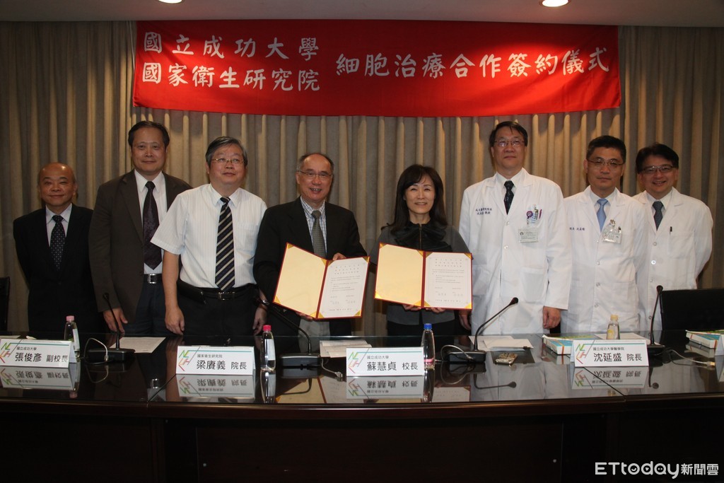 ▲為加速及擴大細胞治療之臨床應用,國立成功大學蘇慧貞校長(右四),與國家衛生研究院梁賡義院長(左四)簽署合作協定。(圖/記者林悅翻攝,下同)