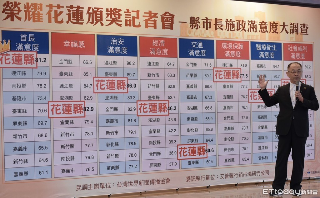 台灣世界新聞傳播協會民調中,花蓮縣得到7個面向的高分,會中,由艾普羅民意調查股份有限公司總經理李大為頒贈「縣市長滿意度金獎」獎狀予徐縣長之外,也頒贈另外6項面向獎狀予縣府各一級首長。