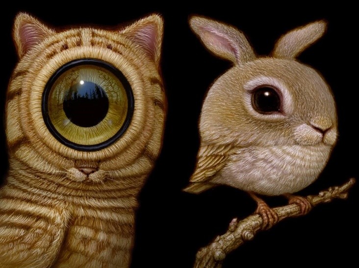 藝術家筆下的這些毛茸茸的小生物,通常都有圓圓的大頭和不成比例的大眼睛,如果仔細觀察還會發現,這些生物都是多種動植物的混和體,蘑菇生長在毛茸茸的貓頭鷹身上,不知道是兔子還是小鳥的生物?