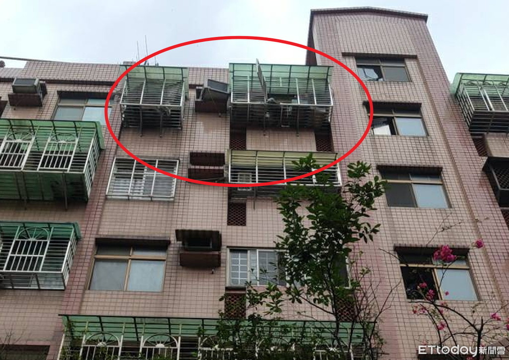 ▲民宅5樓鐵窗炸開、冷氣室外機受波及外斜。(圖/記者陳雕文翻攝)