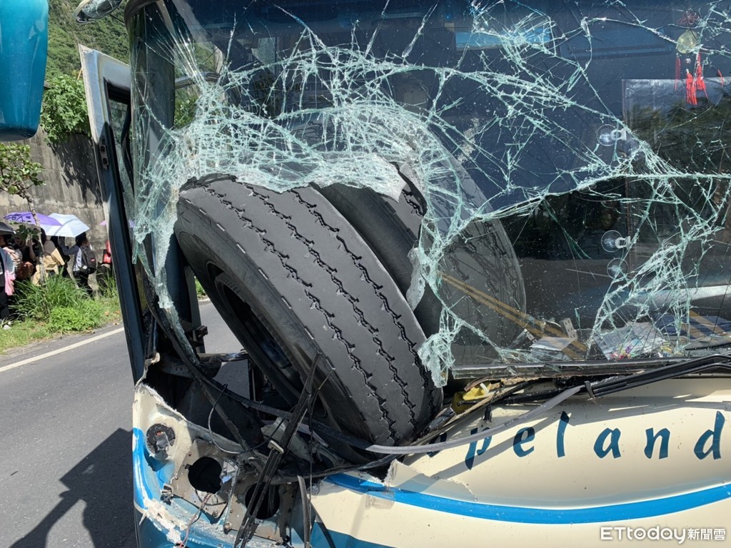 花蓮台9線蘇花公路179.8K南下車道28日上午10時35分發生離奇車禍,一輛遊覽車行經崇德路段時,前方的砂石車的輪胎組突然鬆脫,2顆輪胎向後噴飛,當場砸中遊覽車擋風玻璃,還卡入車頭中,突如其來的巨響也讓司機、乘客全都嚇傻,所幸司機反應得宜,立即穩住車身,才未釀成人員傷亡。目前確切事故原因,警方已到場調查釐清。