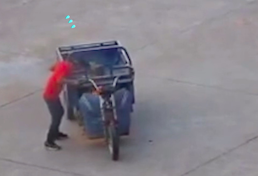 《澎湃新聞》報導,監視器畫面可以看到,這名紅衣男子騎著三輪車進入加油站,男子隨即查覺異樣,掀起坐墊一看,三輪車突然冒出火苗。影片中的他不加思索,直接朝火苗狂吹,希望像吹蠟燭一樣把火勢吹滅。