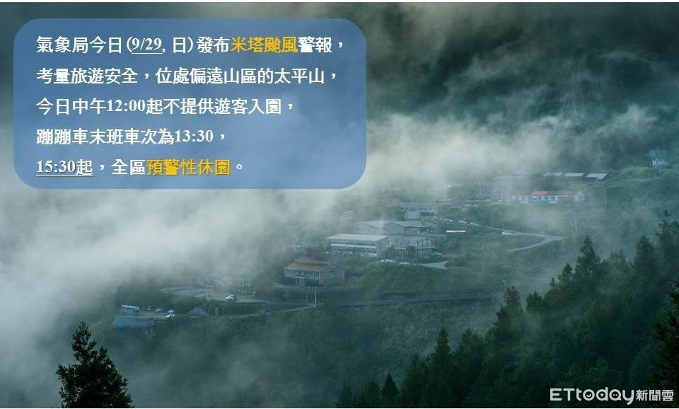 氣象局於29日發布「米塔」颱風警報,林務局羅東林管處宣布,太平山國家森林遊樂區自29日下午3時30分預警性休園,而自然步道也於9月30日預警性封閉,呼籲遊客暫勿前往,以免發生危險。此外,何時開放則視颱風動態再作決定。