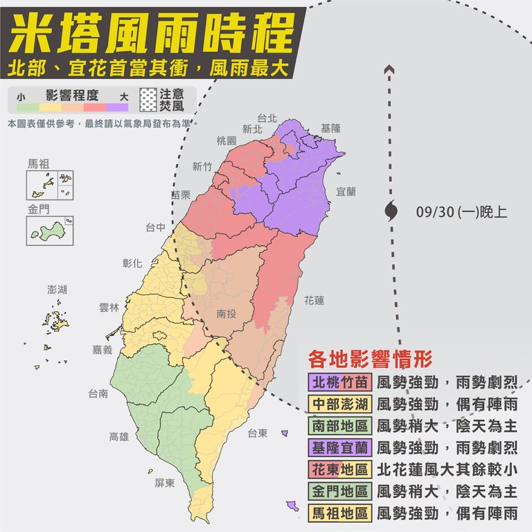 周一早上米塔外圍環流接近,花東將會率先感受到間歇風雨漸強,宜蘭、北海岸、東北角的雨,預期將會從此刻,一路下到颱風來襲。周日下午至傍晚,暴風圈開始進逼,宜蘭、花蓮、北北基,風雨會依序轉強,躲在山脈另一邊的中南部,影響則很小,而西部沿海、澎湖的陣風會很強勁。